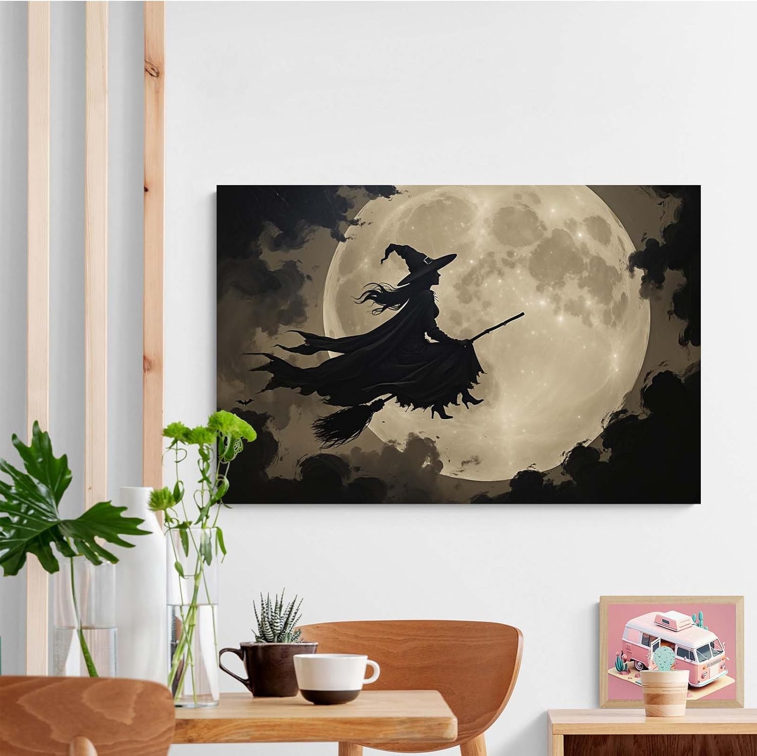 Full moon witch silhouette poster witch on magic broom Halloween mural poster decorative mural art suitable for home living room bedroom28x40in Wood Framed