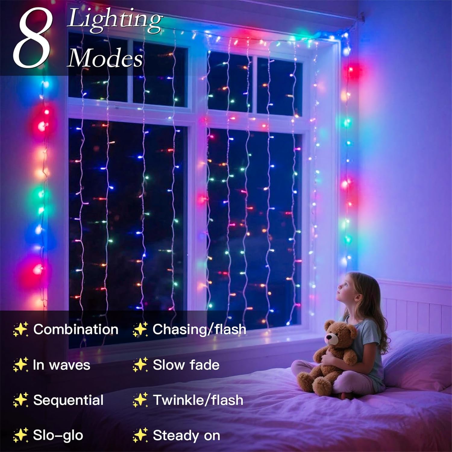 200 LED Rainbow Curtain String Lights 9.8 * 6.6FT Plug in Fairy with Timer and 8 Modes, Waterproof Window Wall Lights for Bedroom Wedding Party Indoor Outdoor Christmas Decor