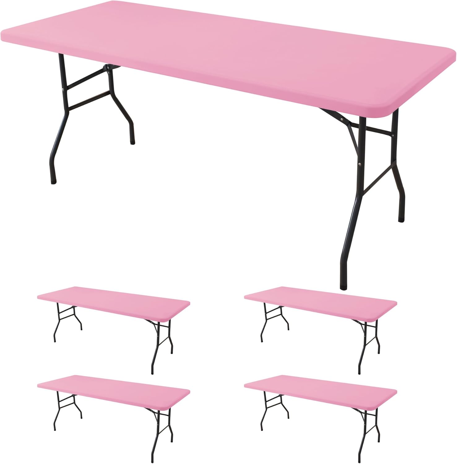 Fitted Tablecloth for 6 Foot Rectangle Tables-4 Pack Pink Elastic Outdoor Picnic Table Cover-Spandex Stretch Folding Table Cloths 6 ft for Camping Dining Room Patio Kitchen Banquet Party
