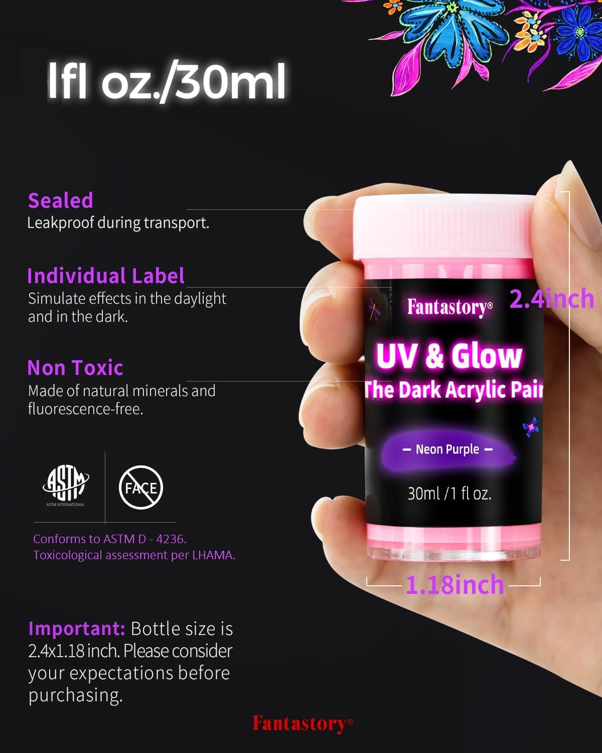 - Holiday Must-Have: Simply charge the paint with a lamp or black light, and move to a dark area, it will glow for a few minutes. The process is simple and fun. For Halloween, Fantastory glow acrylic paint adds an eerie atmosphere to your crafts. Itβs the perfect present for imaginative people and those who love spooky and creative Halloween crafts.
