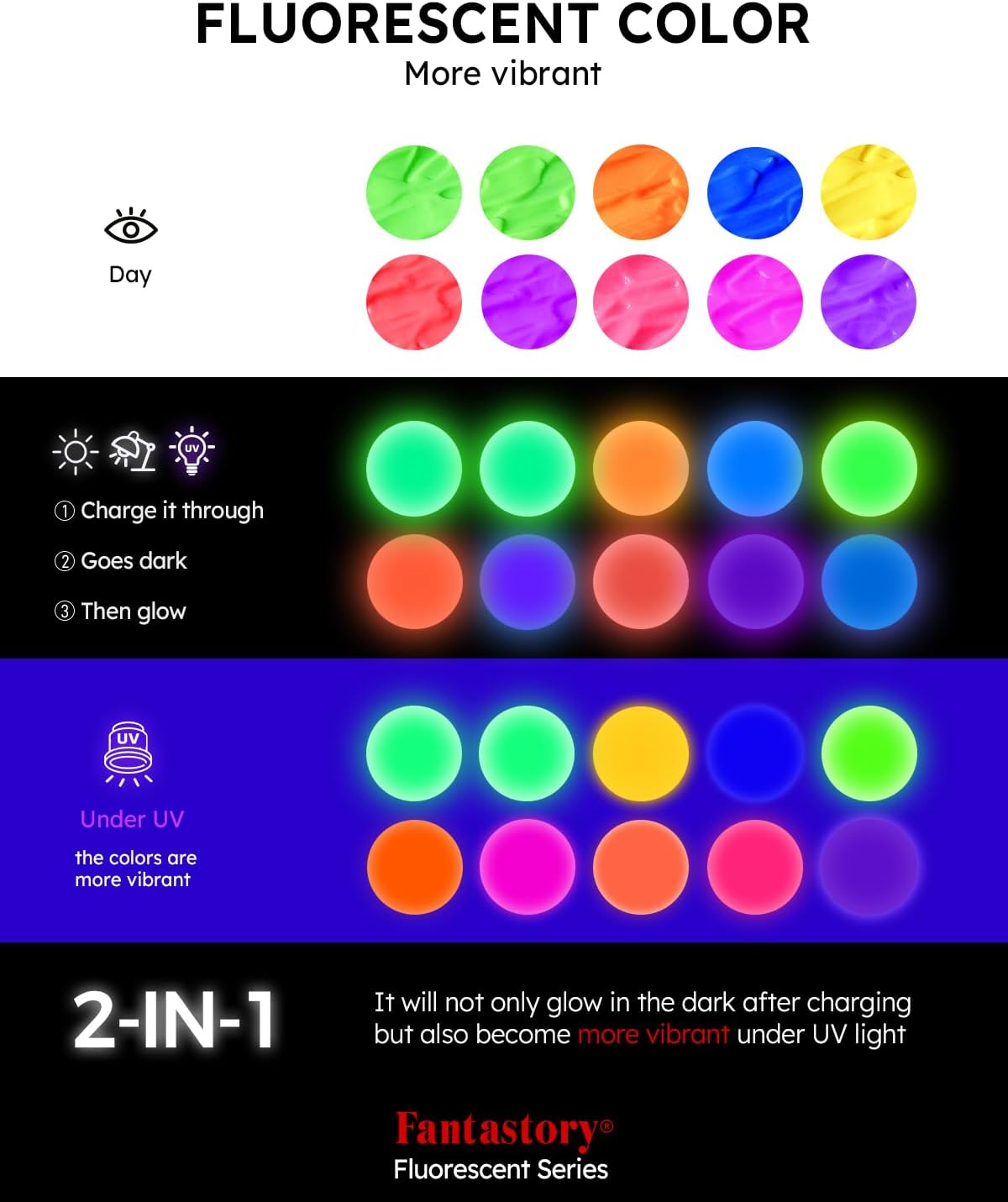- Fluorescent Series Set: These vibrant neon paints are eye-catching during the day and reflect brilliantly under black light. They also glow in the dark for several minutes after being charged. -(Charge with a black light for optimal results.) For Halloween, Fantastory glow paints can add a spooky atmosphere to your crafts. Itβs the great option for imaginative people and those who love spooky and creative Halloween crafts.