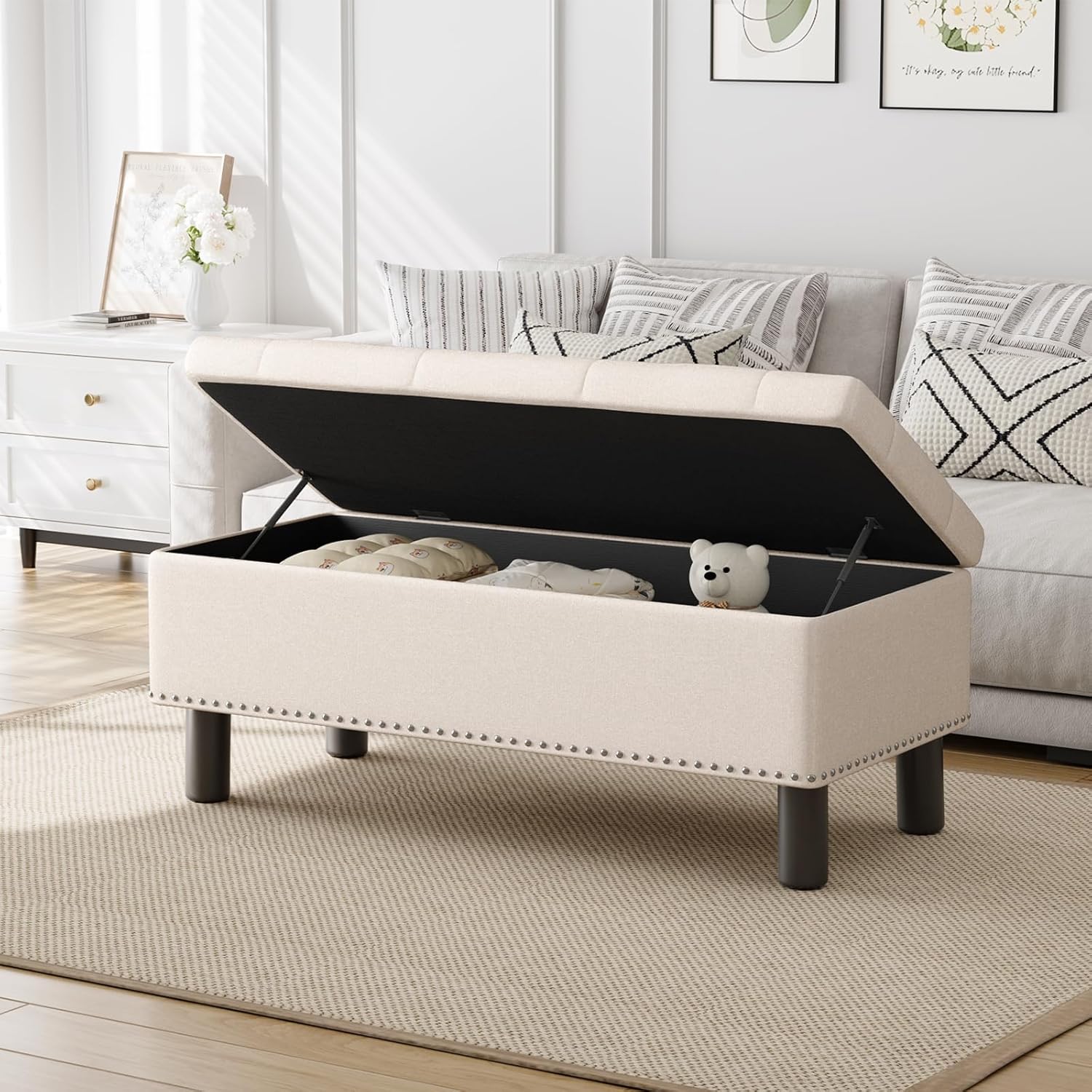 Furniliving 42” Ottoman Bench with Storage, Folding Storage Ottoman Benches with Wood Legs, Upholstered Bedroom Bench with Button-Tufted, Entryway Bench for Bedroom, Linen, Beige