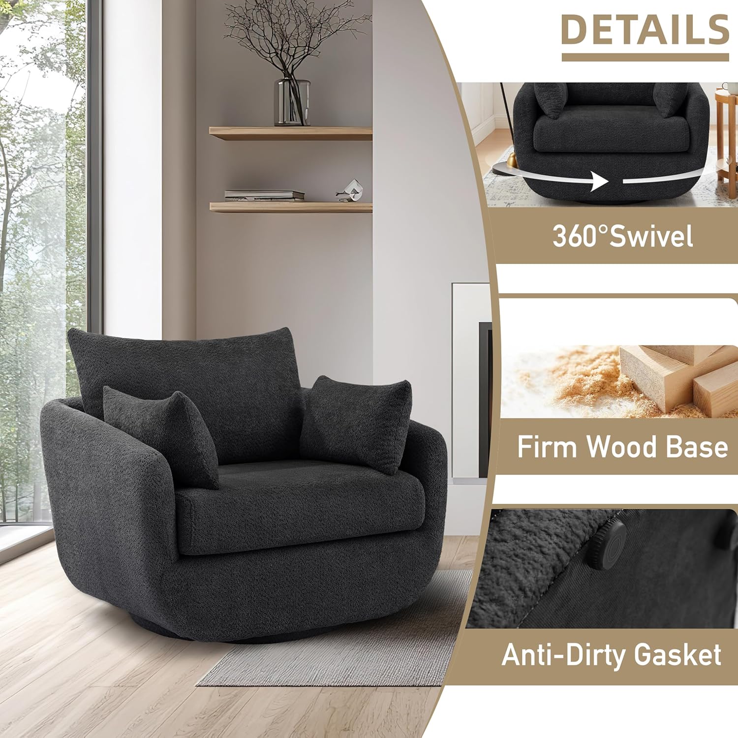- Durable Construction & Floor-Friendly Design---Built to last with a 360° solid wood swivel base (supports 330 lbs) and reinforced steel frame,No wobbling, squeaking, or sudden drops,just silent, stable rotation perfect for conversations,With its swivel base, the chair can rotate fully,maximizing space utilization in smaller rooms.The wood he base is wrapped with black anti-dirty gaske also protects hardwood floors from scratches.