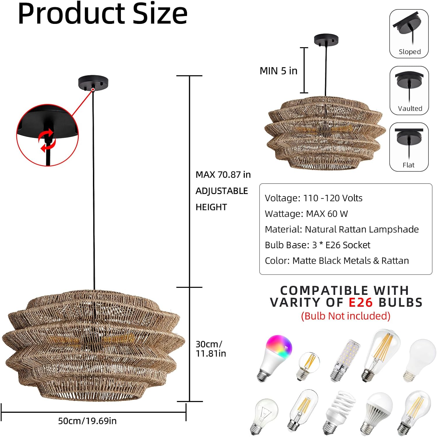 - 【 Light Size&Bulb Requirement】3-Light rattan pendant light, Size:D 50 *H 30 cm/ D: 19.7" * H: 11.81"".Voltage: 110v~240v, Bulb socket and electric cord have passed the UL listed, which can ensure that you use them safely. US standard E26 base socket, maximum 60W, suitable for Incandescent, LED, halogen, CFL, etc (Bulb Not included)