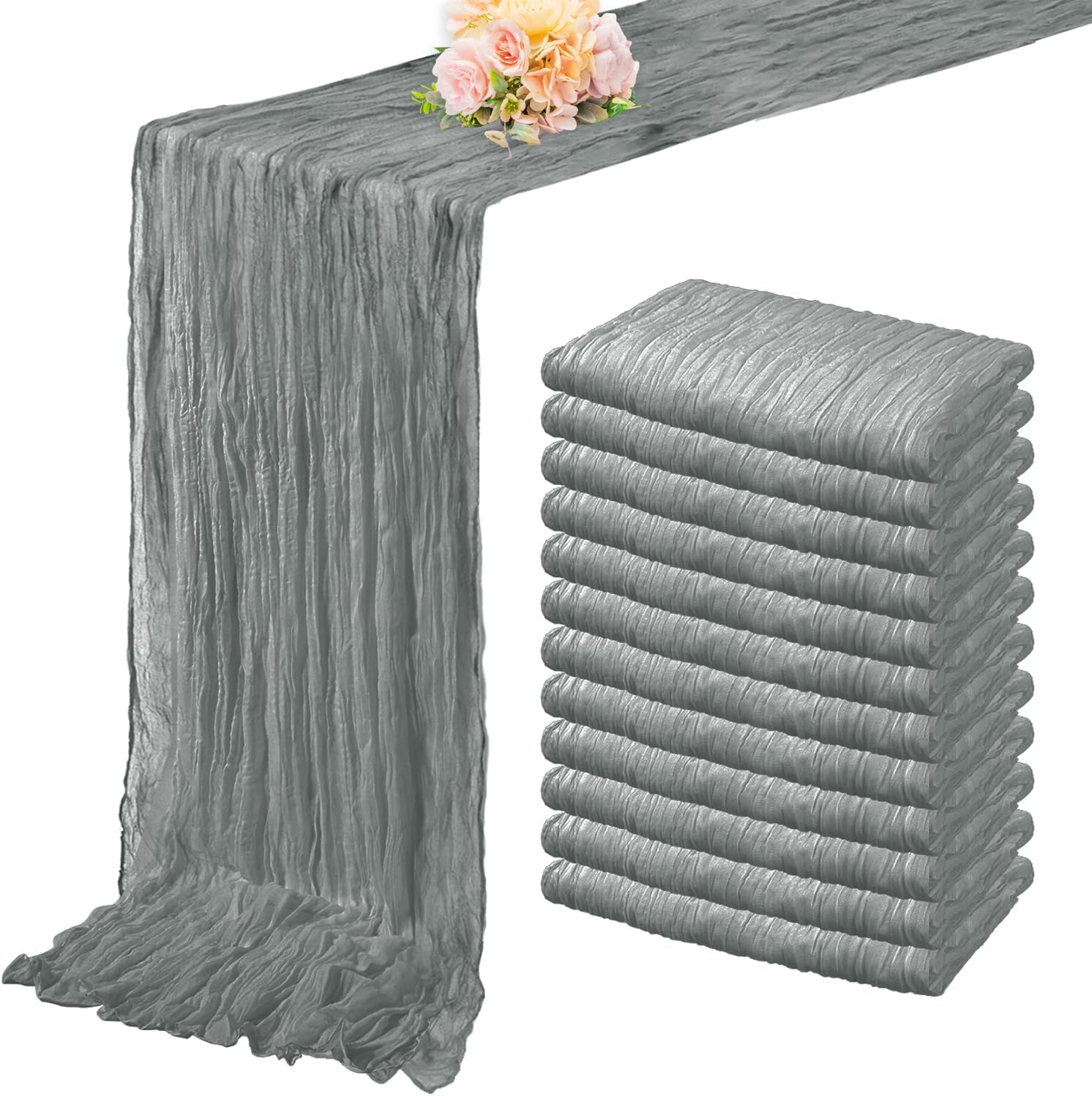 - Cheesecloth Table Runner Size: You will receive 12 gray cheesecloth tablerunner, each measuring 20 x 120 inches. The quantity is sufficient for you to decorate various romantic occasions. It can decorate most shaped tables, such as rectangular tables, round tables, and cocktail tables. It is long enough to decorate a large table and be placed perfectly and elegantly on the tabletop, adding a romantic atmosphere to your occasion.