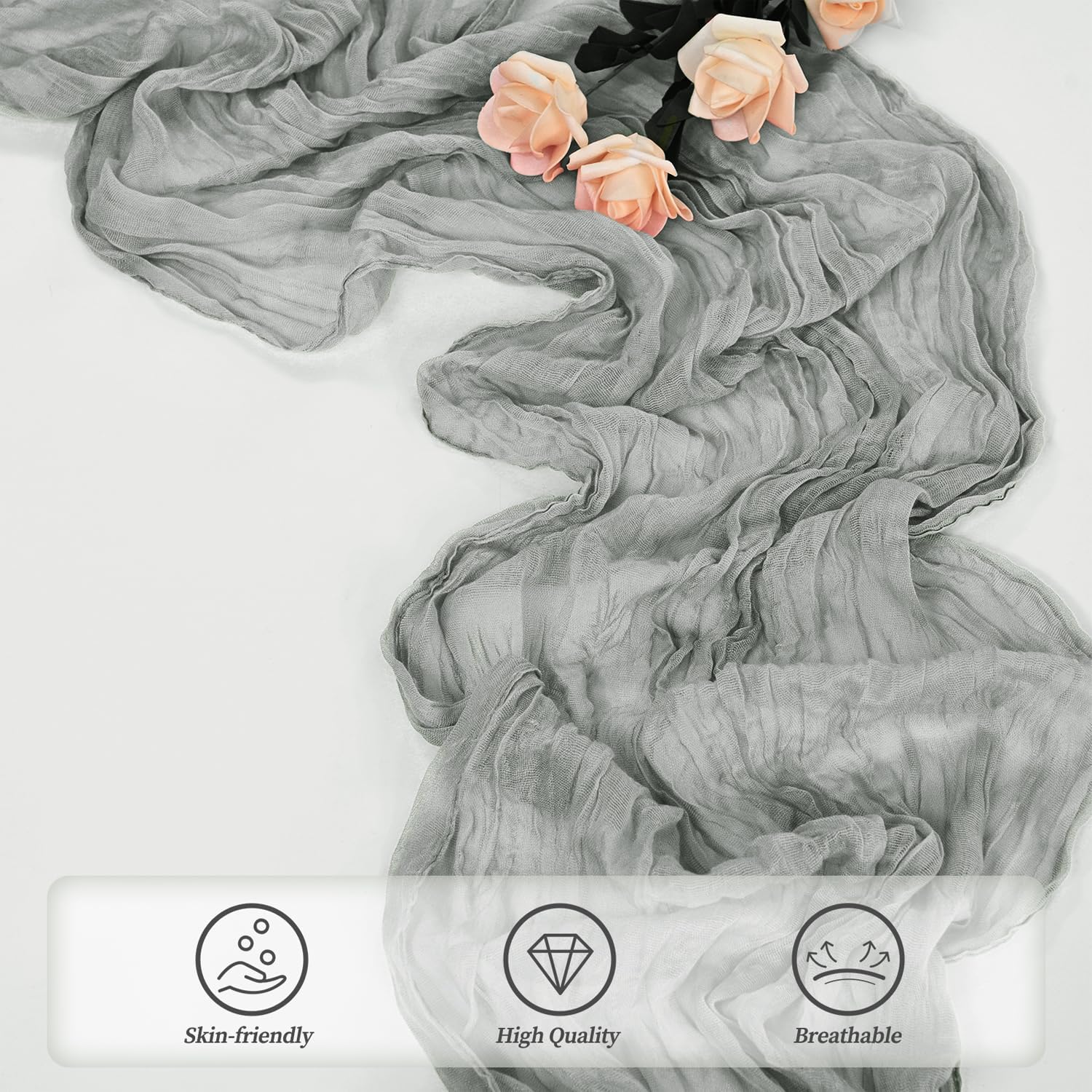 - Elegant Design: This cheese cloth runner is a perfect decorative element for dining tables and parties. Its pleated design makes it very elegant and romantic, flowing naturally on the table like water, making the dining table for weddings and parties look very beautiful. It can be paired with flowers and candlesticks, or tied with a bow to create various romantic feelings.