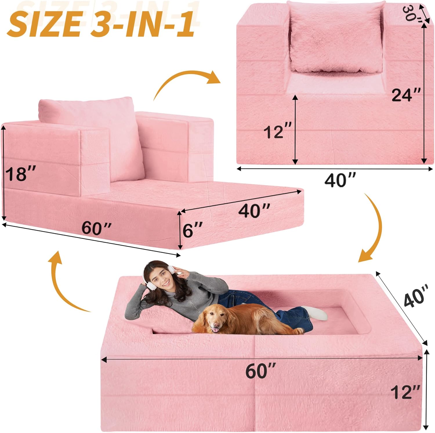 Folding Bean Bag Chair for Adults,3-in-1 Bean Bag Couch Faux Fur Floor Sofa Large Beanbag Convertible Bean Bag Sofa Bed with Pillow in Bedroom,Living Room,Apartment(Twin,Pink)
