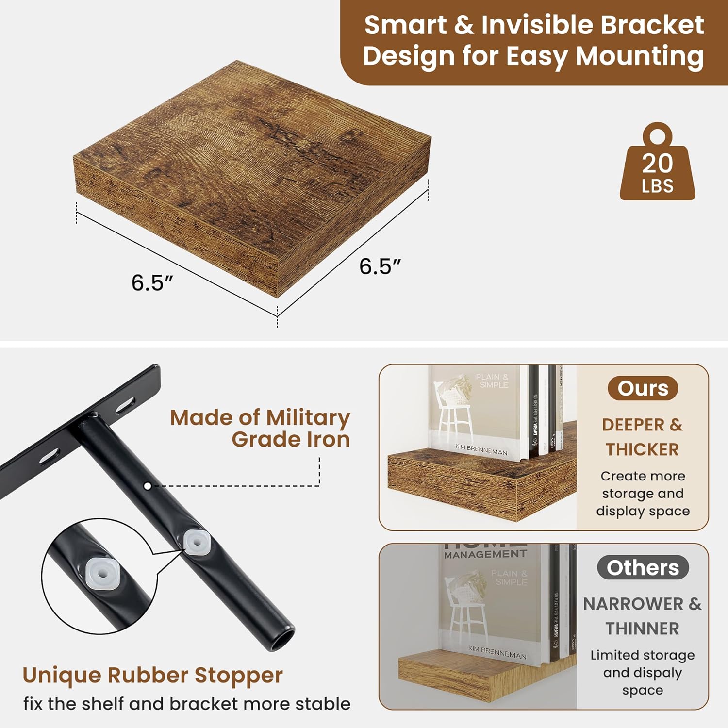 fuqing Floating Shelves for Wall, Bathroom Shelf Wall Mounted for Storage, Shelves with Invisible Bracket for Bedroom, Kitchen, Living Room, Farmhouse Small Book Shelf, 6.5 Inch Set of 3, Rustic Brown