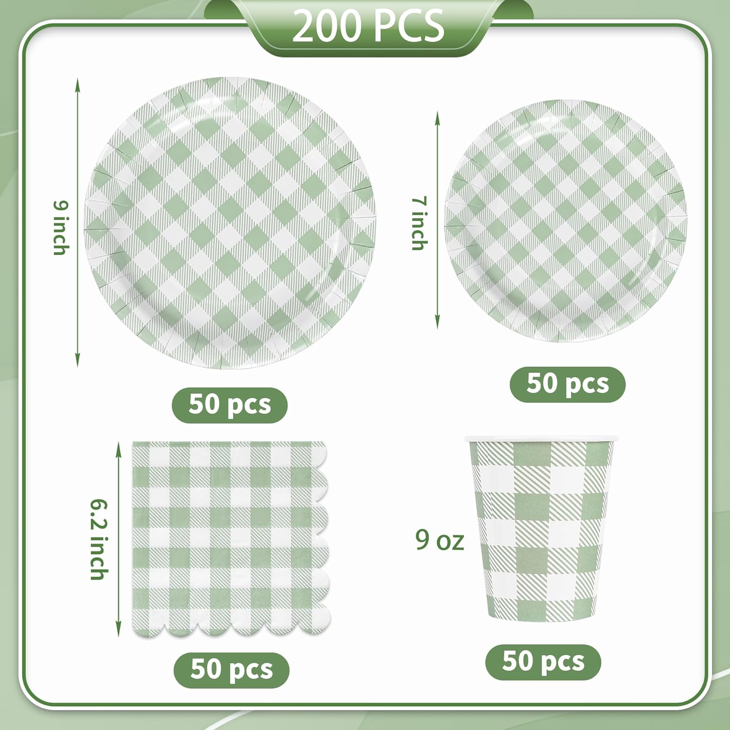 200Pcs Sage Green Gingham Party Supplies Gingham Paper Plates and Napkins Cups Sage Plaid Plates Disposable Green and White Plaid Party Decor for Birthday Family Picnic BBQ,Serves 50 Guests