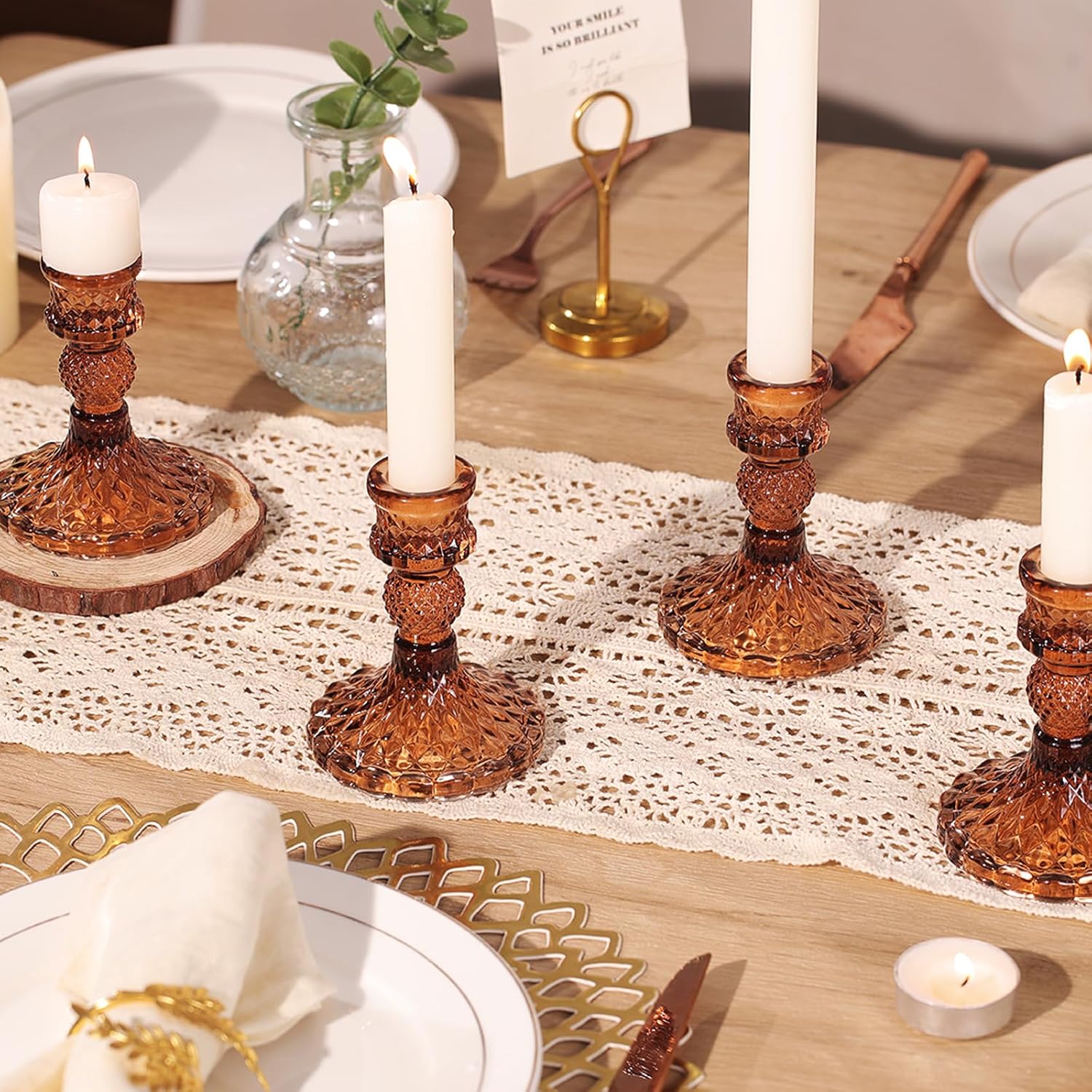 12Pcs Amber Candlestick Holders Set- 4" H Taper Candle Holders Bulk, Glass Candle Holders for Wedding, Party, Fall Dinner Table Centerpieces, Festival Gifts & Windowsill Decor