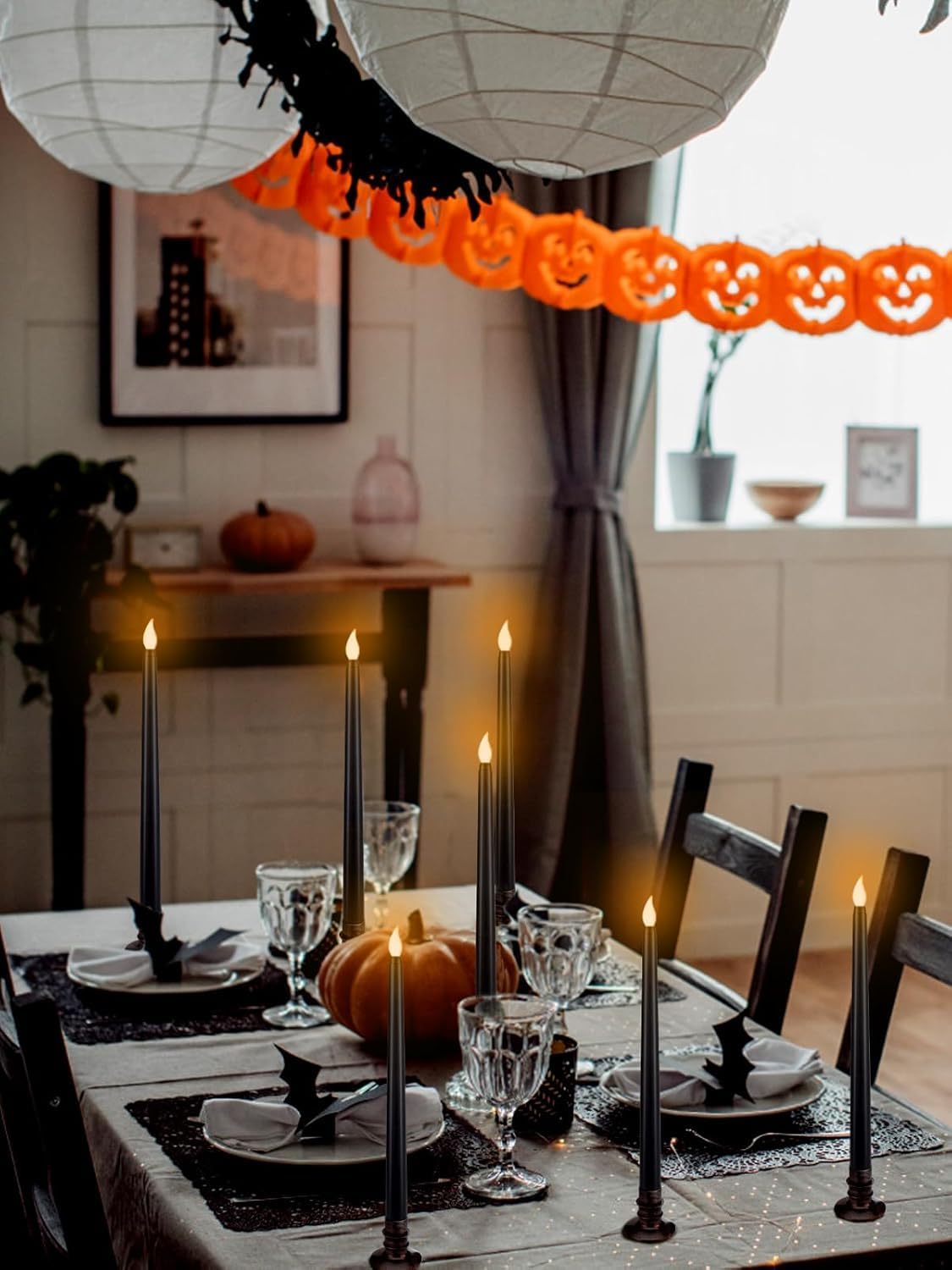 - [Creating a Halloween Atmosphere]: This flickering tapered candle is 10.7 inches tall. When placed on the base, it is 12.2 inches high in total. They're perfect for your home's fireplace, dining table, and windowsill. You can also put these candles with pumpkin lanterns and skull decorations to create a spookier atmosphere for Halloween.