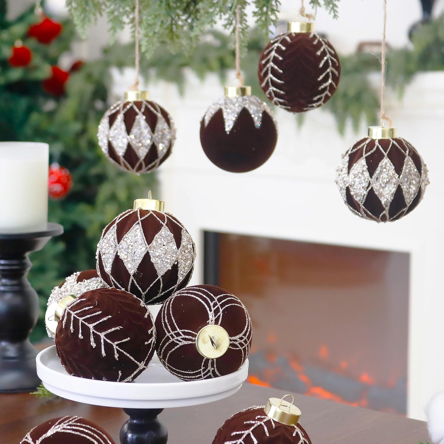 3.15INCH Brown Velvet Ornaments for Christmas Tree, 12PCS Glitter Flocked Christmas Ornaments Decorations Balls Set Decor