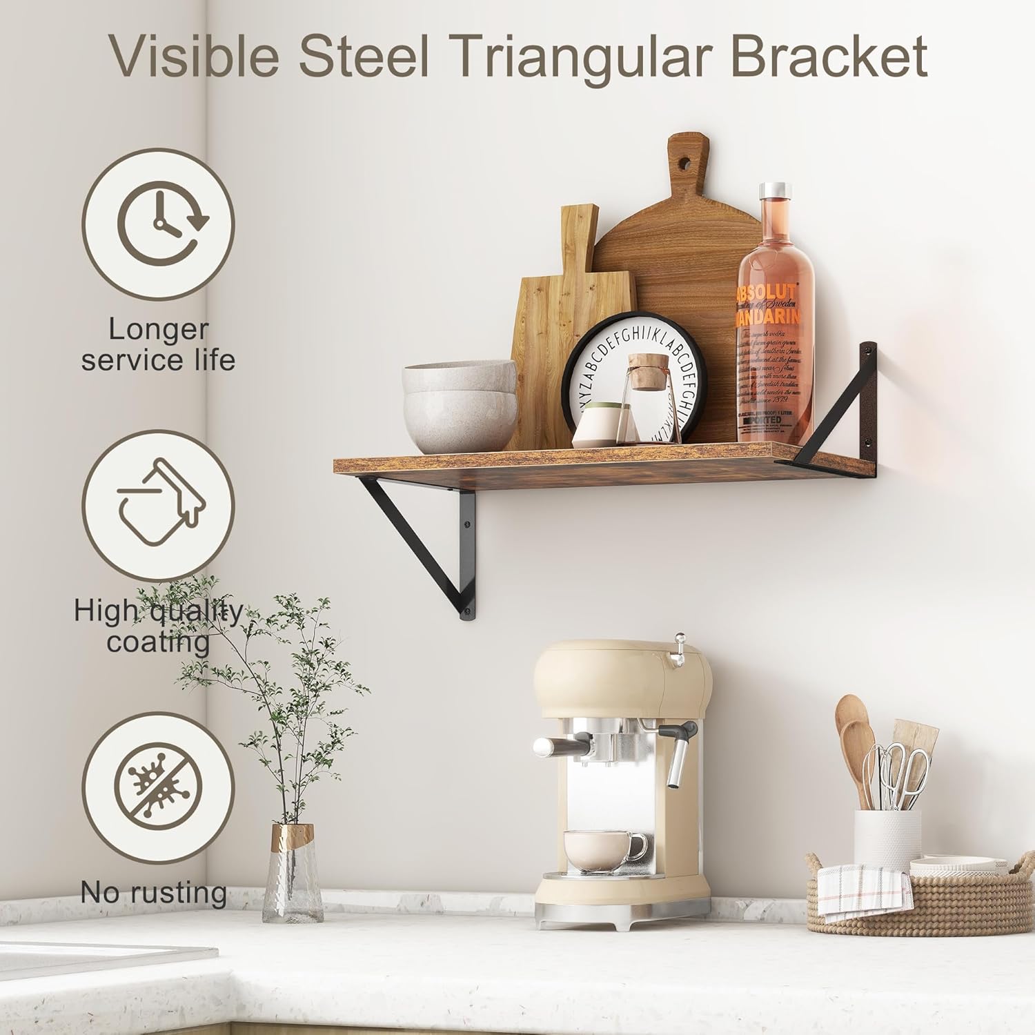 - ăFARMHOUSE RUSTIC WALL SHELFăThese floating shelves are made of premium engineered wood board and visible triangular bracket. The rustic wooden grain surface add character and warmth to any modern or traditional interior with these deep floating shelves, contrast shelves at staggering heights on the wall or mount side-by-side or in the corner for a clean streamlined look.