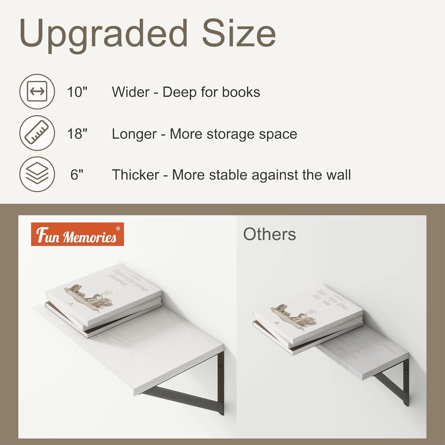 - ă10 INCH DEEP FLOATING SHELFăThis extra deeper and wider wall shelves are 10 inches in depth and 18 inches in length instead of the regular narrow floating shelves, you can put photos, pictures, DVD players, videos, books, toys, and some other knickknack on this beautiful display wooden shelf.