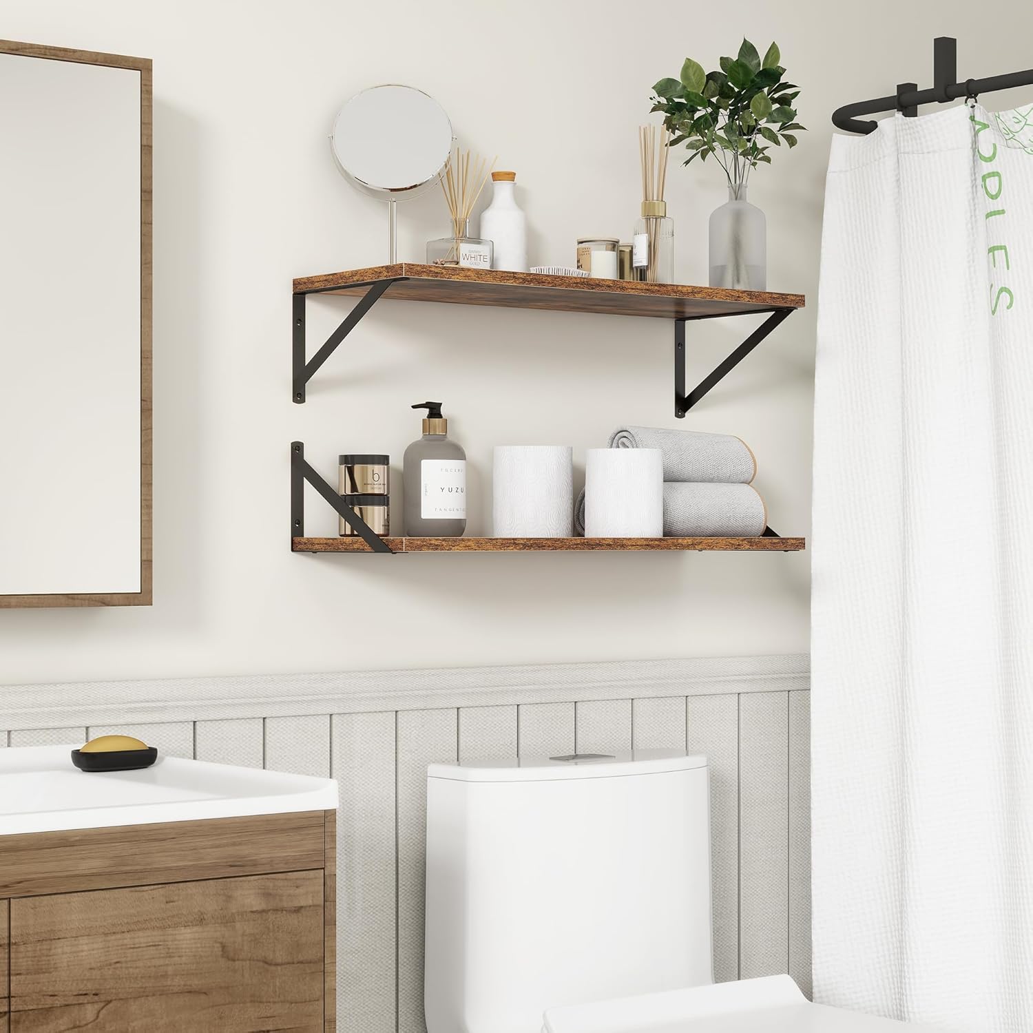 - ăFARMHOUSE RUSTIC WALL SHELFăThese floating shelves are made of premium engineered wood board and visible triangular bracket. The rustic wooden grain surface add character and warmth to any modern or traditional interior with these deep floating shelves, contrast shelves at staggering heights on the wall or mount side-by-side or in the corner for a clean streamlined look.