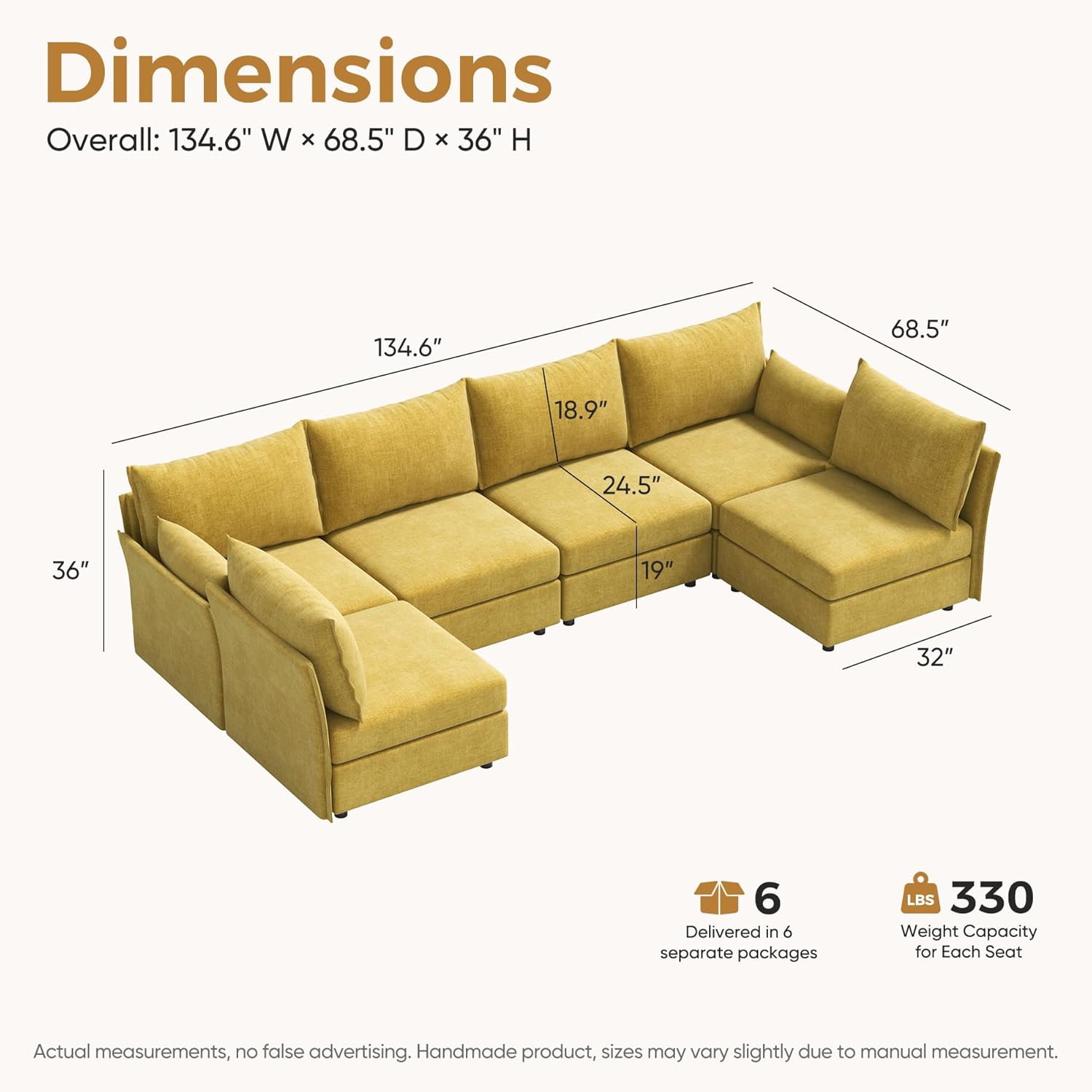 - 💡 Stylish and Spacious Sectional Sofa - A blend of modern elegance and comfort, this yellow sofa is ideal for contemporary interiors. Customize seating and shape by adding or removing modules to fit your needs. It's perfect for your living room, family room, bedroom, or office. Overall size: 134.6" W × 68.5" D × 36" H, seat width: 32", seat depth: 24.5".