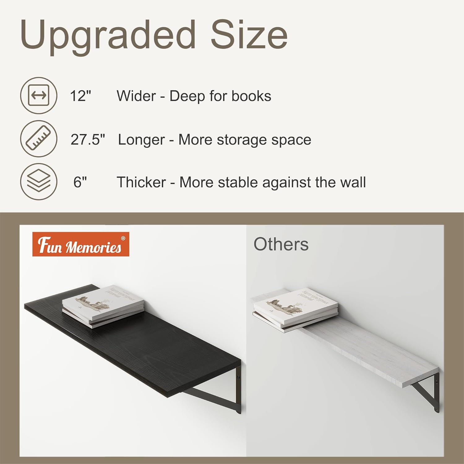 Fun Memories 27.5" W x12 D Floating Shelves, Black Wall Shelf with Brackets, 12 Inch Deep Floating Shelf Set of 2, Large Storage Kitchen Living Room Bathroom Shelves, Wood Wall Mounted Shelf