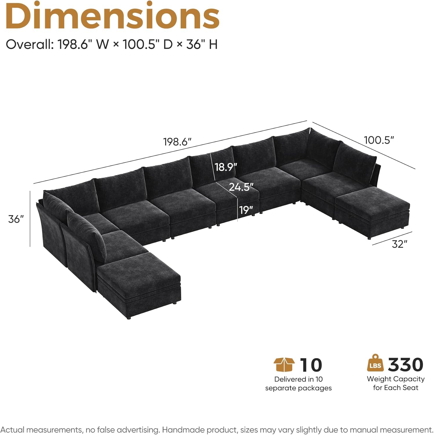 - 💡 Stylish and Spacious Sectional Sofa - A blend of modern elegance and comfort, this Black sofa is ideal for contemporary interiors. Customize seating and shape by adding or removing modules to fit your needs. It's perfect for your living room, family room, bedroom, or office. Overall size: 198.6" W × 100.5" D × 36" H, seat width: 32", seat depth: 24.5".