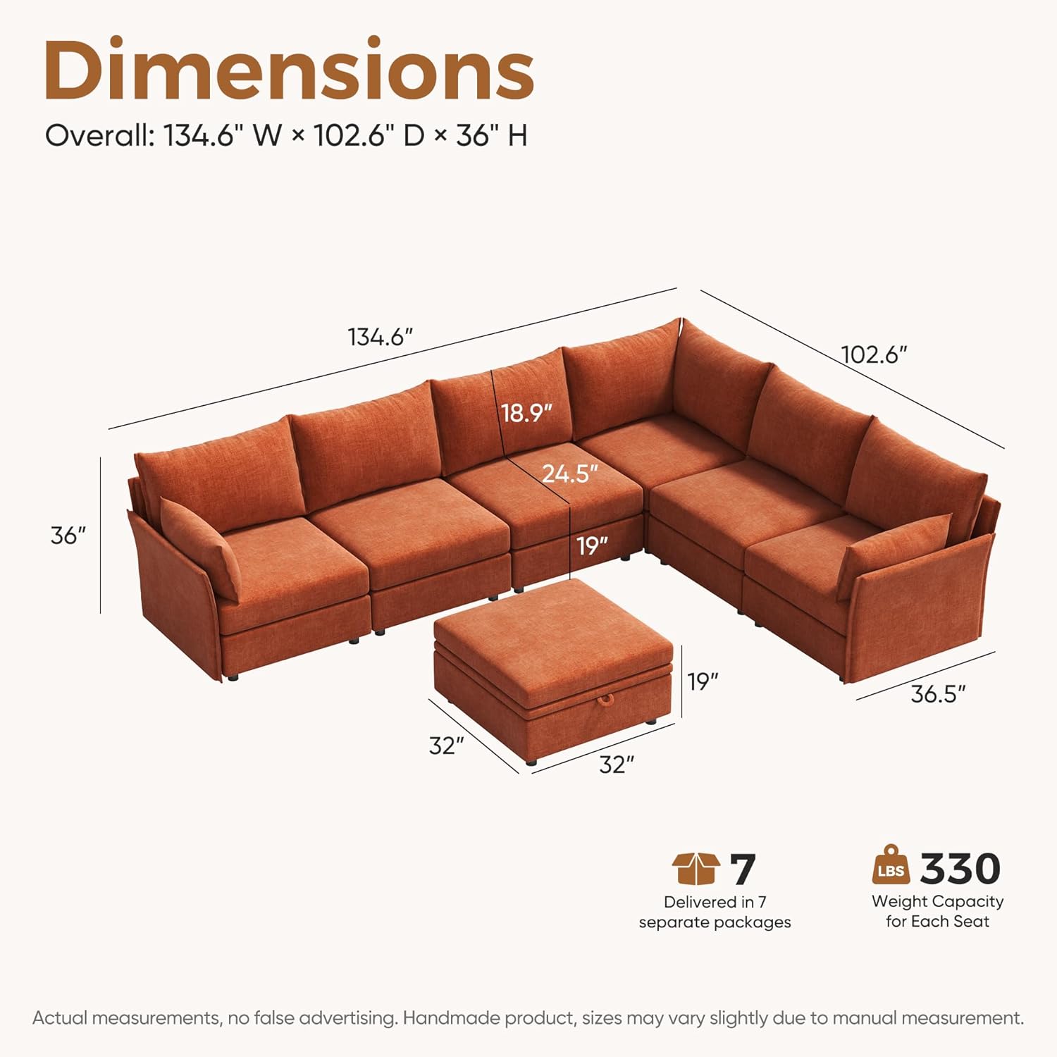 - 💡 Stylish and Spacious Sectional Sofa - A blend of modern elegance and comfort, this terracotta sofa is ideal for contemporary interiors. Customize seating and shape by adding or removing modules to fit your needs. It's perfect for your living room, family room, bedroom, or office. Overall size: 134.6" W × 102.6" D × 36" H, seat width: 32", seat depth: 24.5".