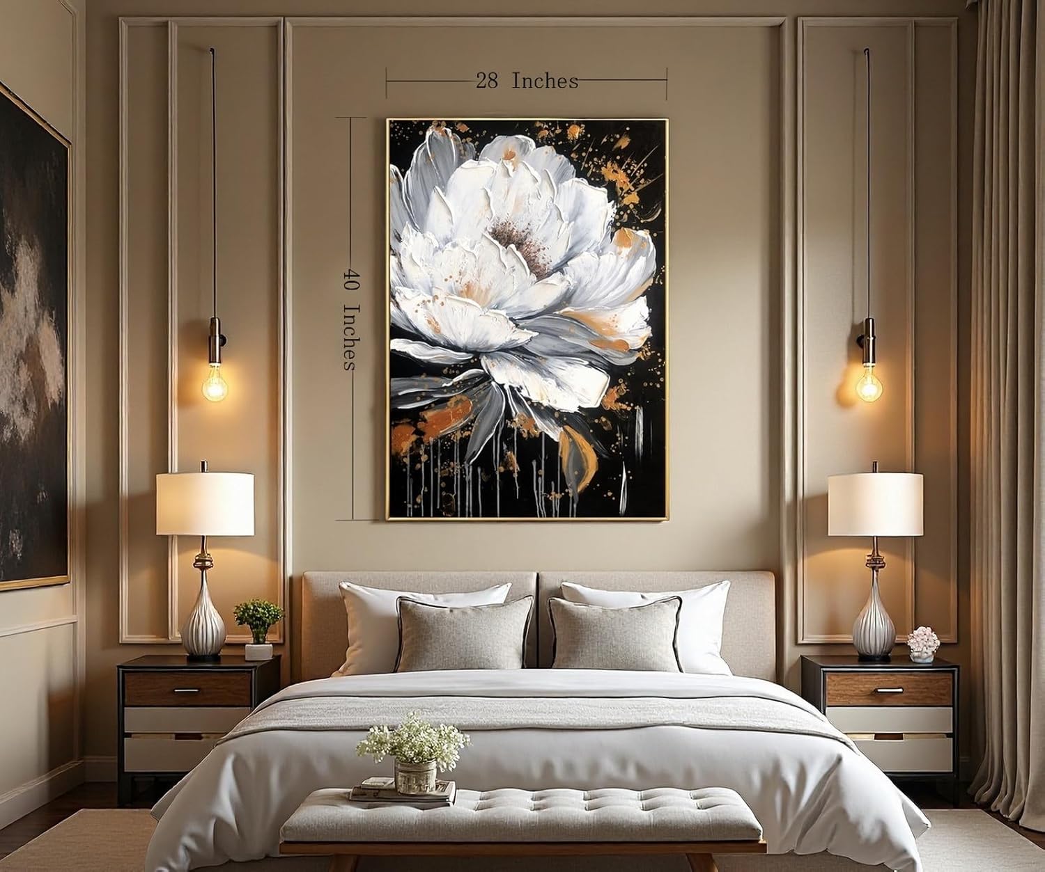 Framed White and Black Flower Wall Art for Study,Hand Painted Floral Oil Painting for Bedroom,Modern Textured 3D Artwork Office Kitchen Decor 28x40inch