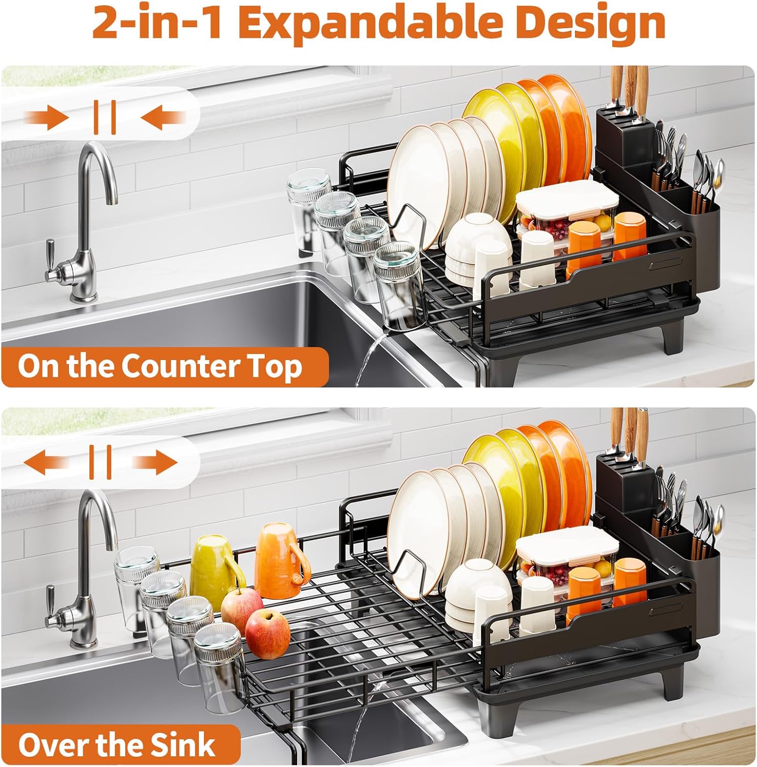 - 2-in-1 Expandable Design: The adjustable legs extend from 15" to 23" to fit different sink sizes. This versatile dish drying rack stays stable with non-slip rubber feet, while raised edges prevent tipping. Part of the dish strainer rests over the sink to save valuable counter space