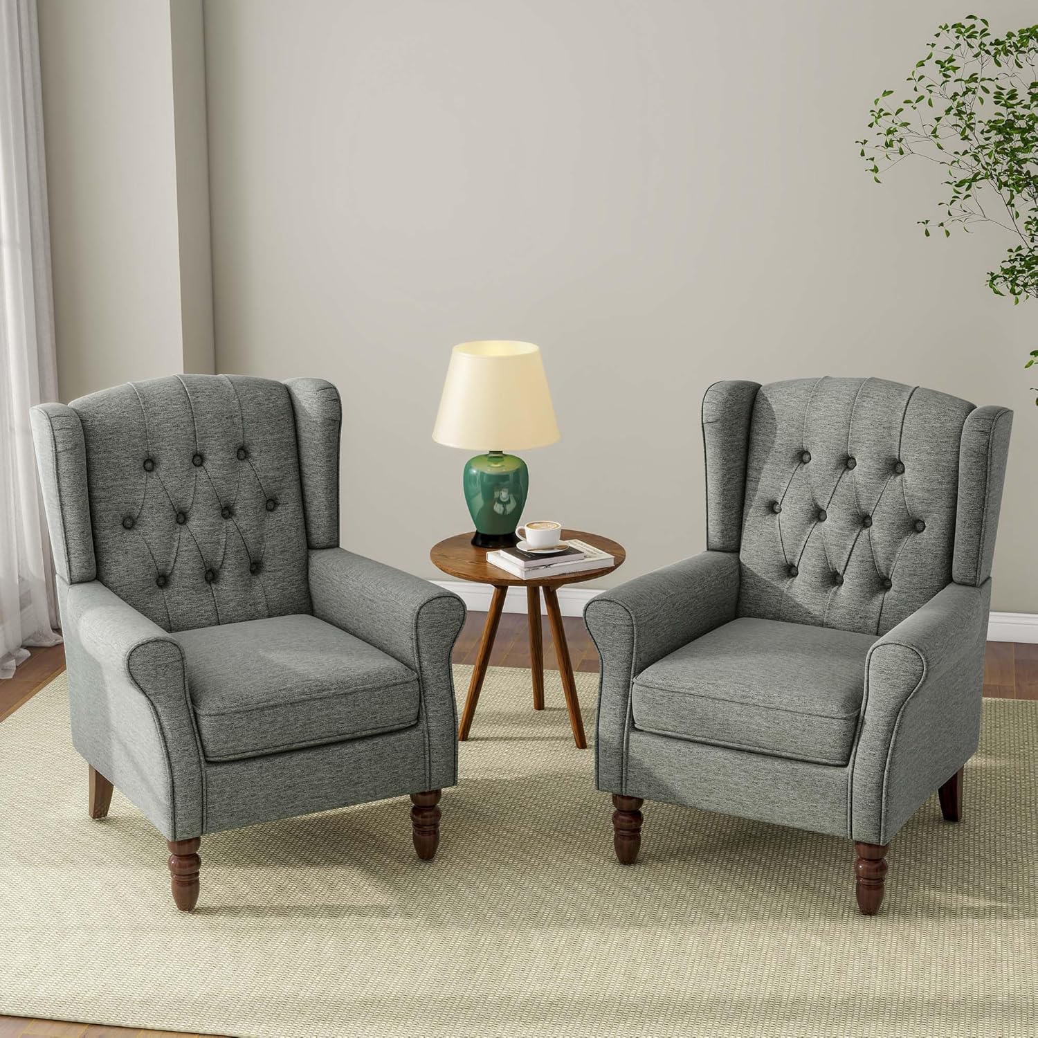 Accent Chair, Upholstered Armchair with Button Tufted High Back & Solid Wood Legs, Comfy Wingback Reading Single Sofa Chair for Small Spaces, Living Room, Bedroom (Grey, Set of 2)