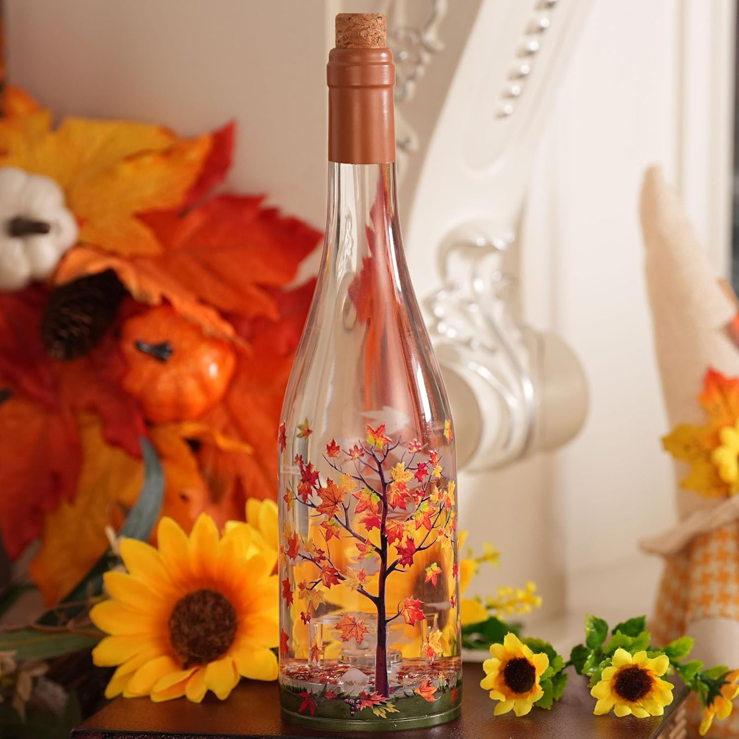 - AUTUMN DECOR: Acrylic wine bottle shape filled with glittering golden maple leaves that swirling when shaken, adding a sophisticated touch to autumn home decor