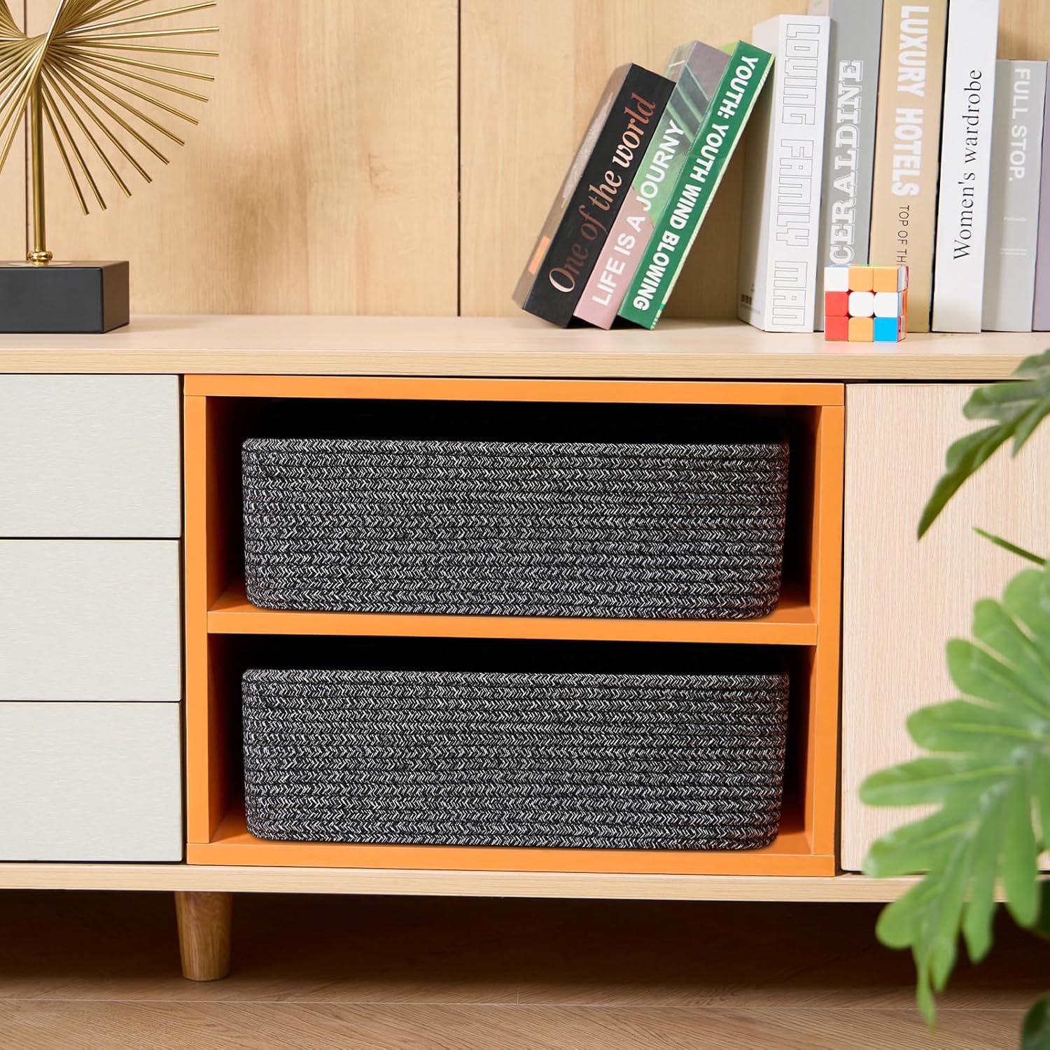 - [ Stylish & Versatile ]: Great for organizing small items on desks, in closets, wardrobes, or dressers—these cute baskets add texture to any living room, bedroom, or bathroom, appealing to fans of modern minimalist design