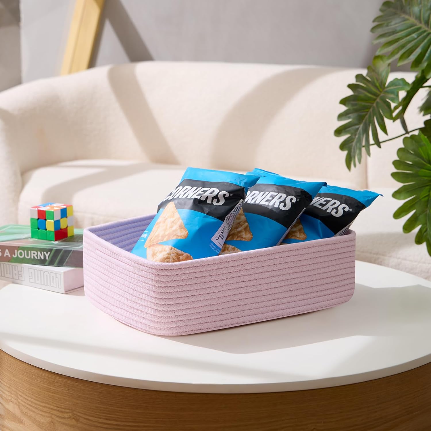 Large Shallow Organizing Baskets 15x11x5.1 Inches - Rope Woven Storage Bins for Bathroom, Shelves, Cube Closet, Light Pink 2 Packs