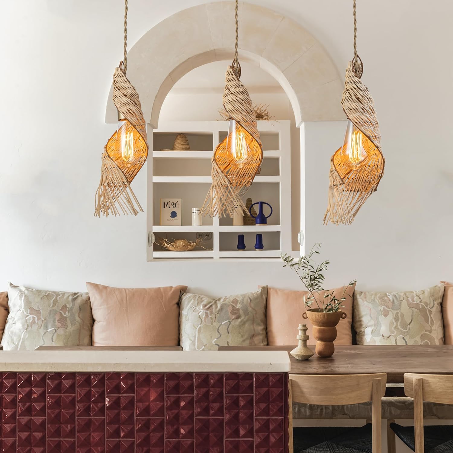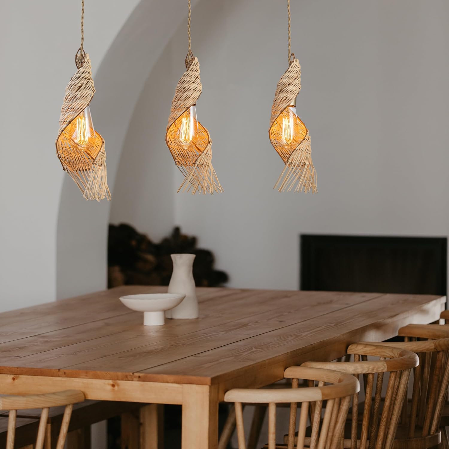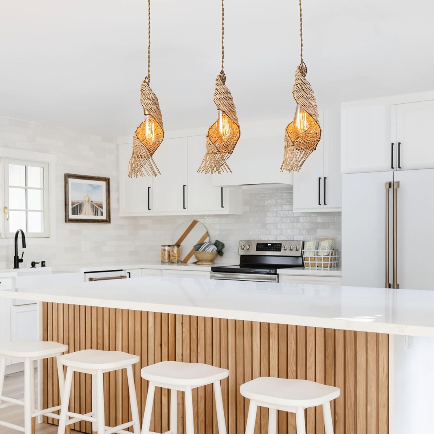 - Boho-Chic Kitchen Lighting – This 3-light spiral rattan pendant is perfect for kitchen islands, featuring a unique cluster of woven rattan shades that bring texture and coastal charm.