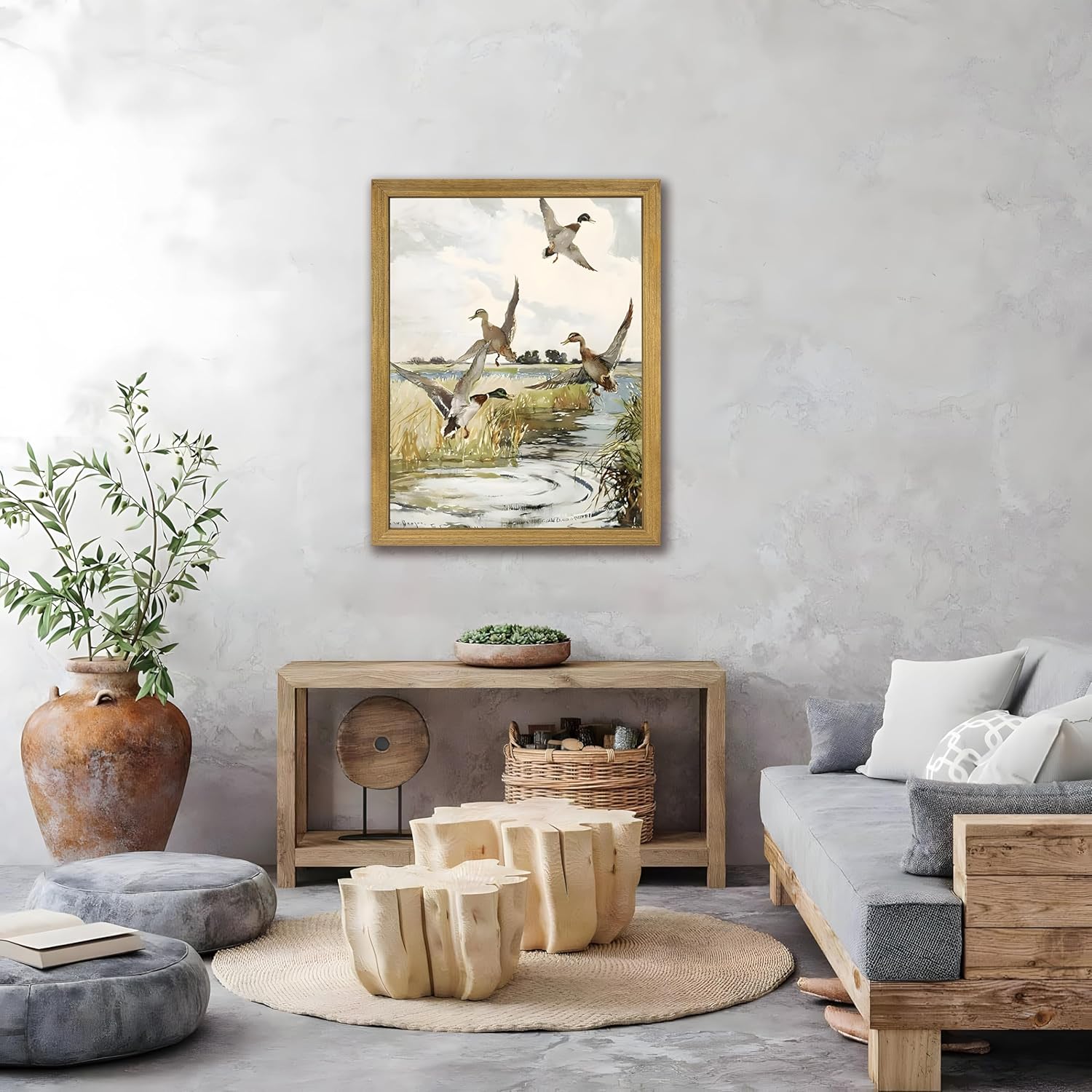 - Timeless Vintage Wildlife Artwork Features a beautifully detailed watercolor illustration of mallard ducks in flight over a peaceful marsh. This classic design blends poster appeal with artist-quality paintings, perfect for fans of wildlife art, vintage decor, and rustic living.