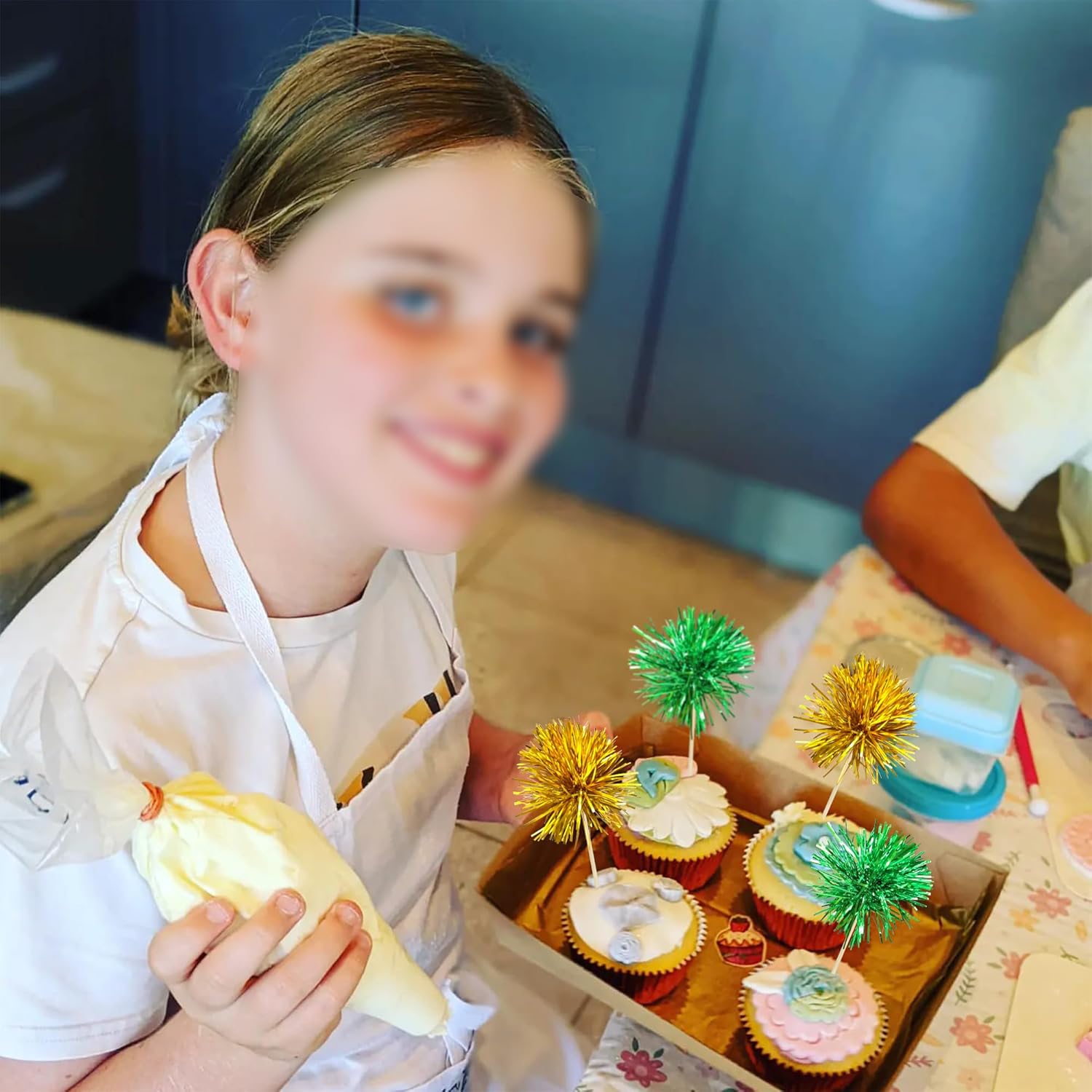 Ephlyn 30Pcs Foil Firework Cupcake Toppers Sparkle Tinsel Cupcake Picks Birthday Cake Decorations Drink Stirrers Cocktail Food Fruit Toothpicks for Baby Shower Graduation Party Supplies Green Gold