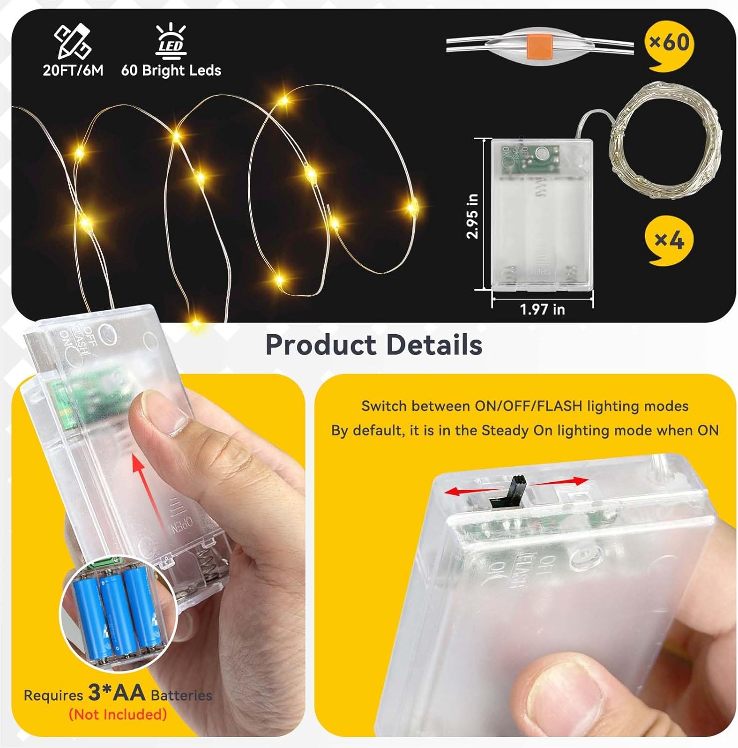 - Dual-Mode Fairy Lights: Easily switch between a steady warm glow and a flash mode using the "ON/OFF/FLASH" switch on the battery box. Steady On provides reliable illumination perfect for reading or elegant table decor. Flash creates instant romantic charm, ideal for parties, holiday gatherings, or magical outdoor nightscapes—effortlessly set your desired ambiance with just one click!