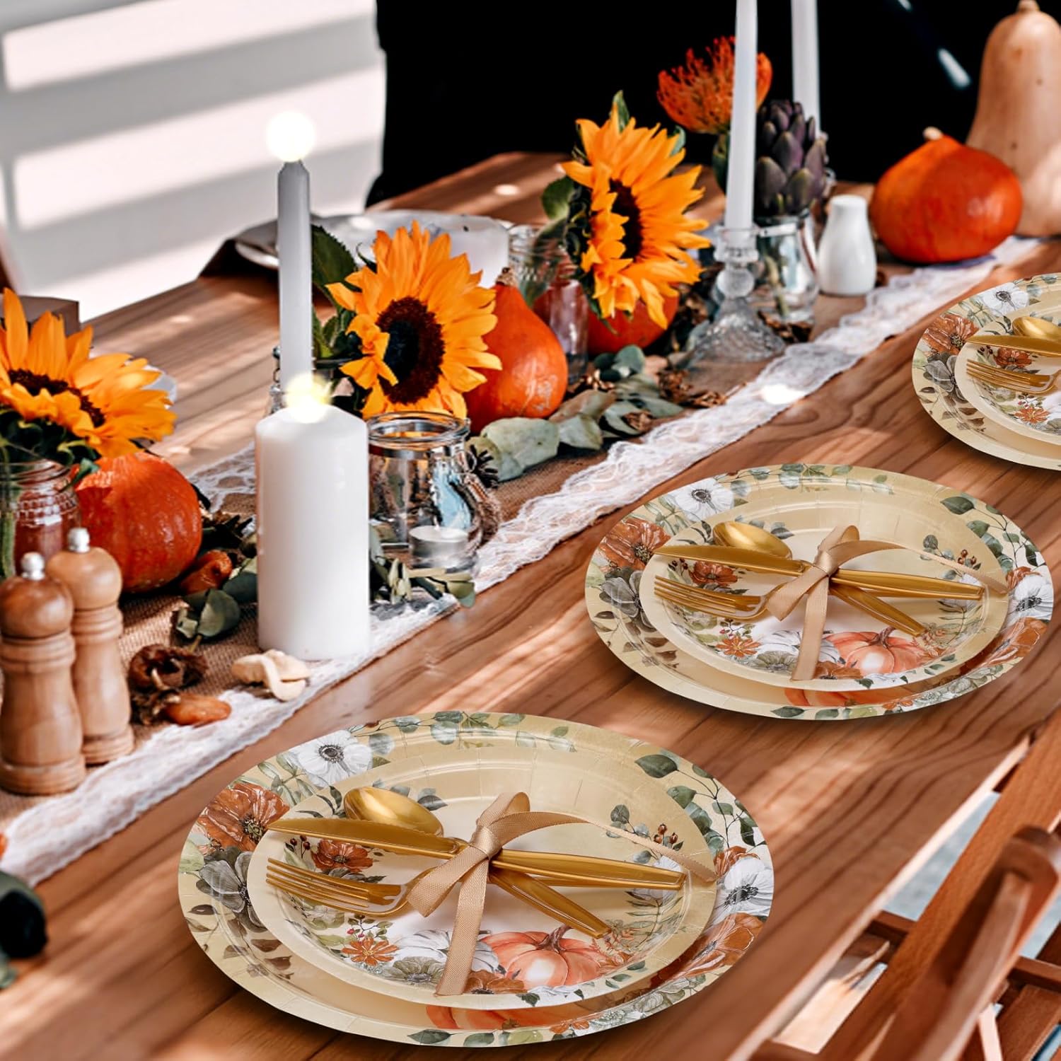 - Happy Thanksgiving Theme Design: our disposable Thanksgiving tableware set features stunning designs with vibrant pumpkin and floral; These artistic and elegant designs will lend a decorative touch to the party setting; Watch as our tableware transform ordinary setups into remarkable dining experiences; Your guests will be delighted by our plates' subtle, yet striking aesthetic appeal