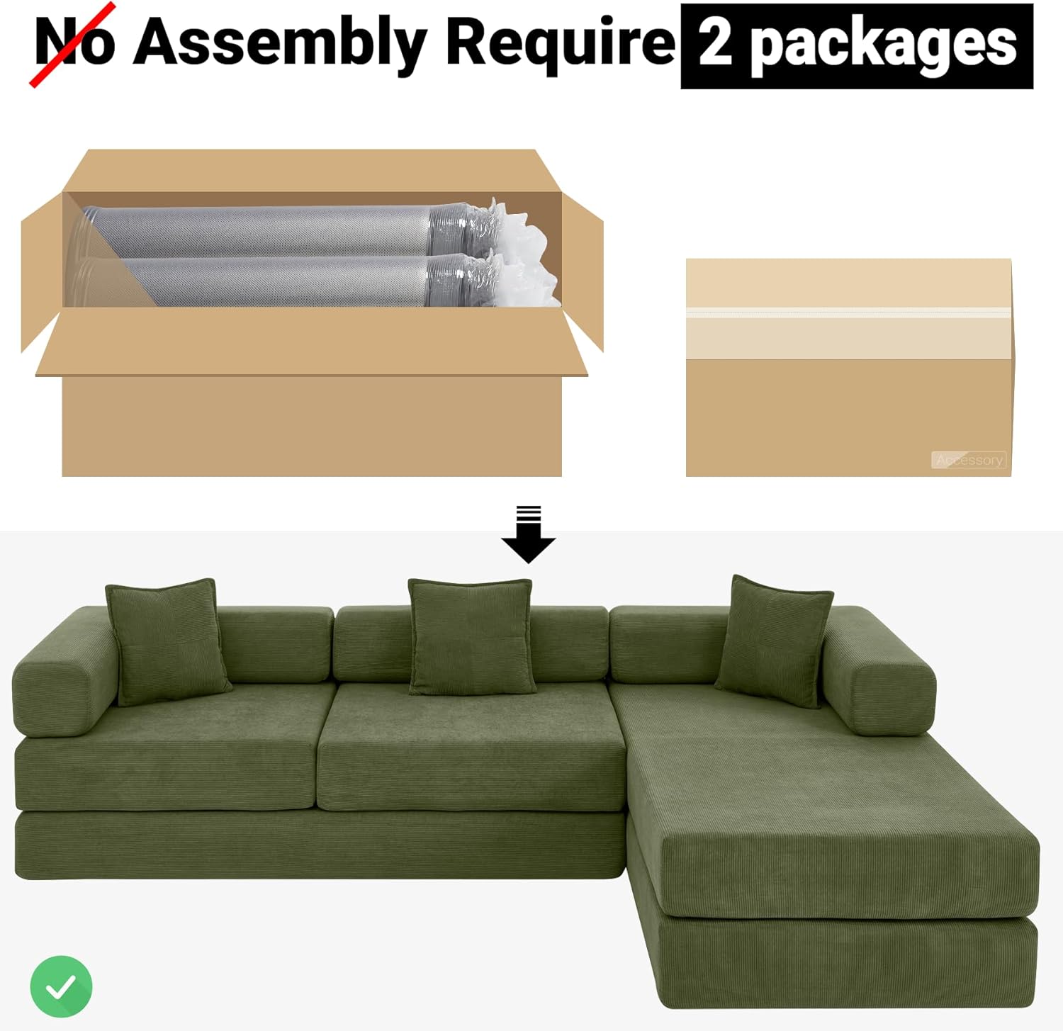 108" Oversized Convertible Sleeper Sofa Bed, Corduroy L Shape Sectional Couch, Folding Sofa Bed with Side Pocket, Modern Cloud Floor Mattress Couch, Modular Sofa for Living Room, Green
