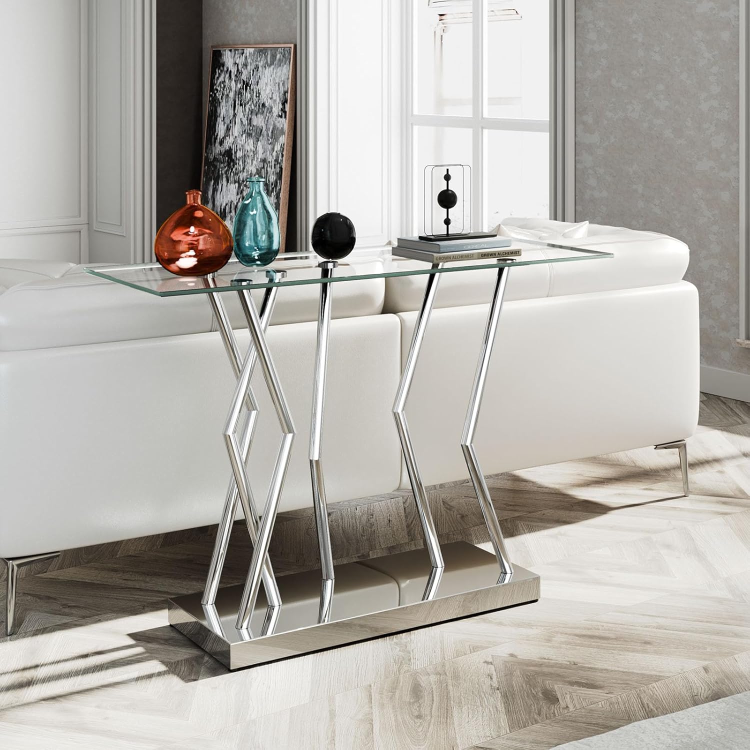 43.3" Glass Modern Console Table, Sturdy Silver Entryway Table with Stainless Steel Base, Rustic Entrance Table, Minimalist Narrow Tables for Living Room & Office