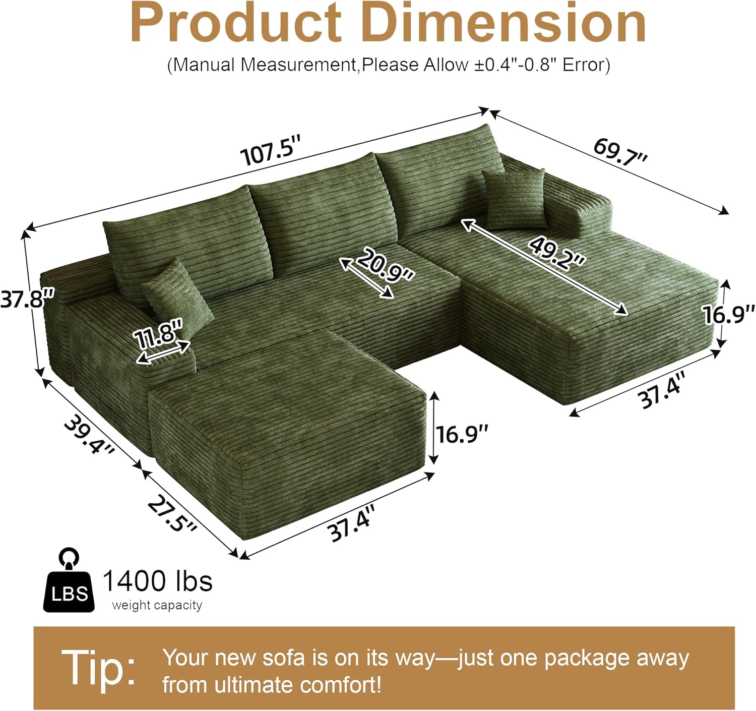 108" Sectional Couches for Living Room Modern Modular Sofa with L-Shape Couchs Upholstered Boneless Couch Deep Seat Sectional Couch with Chaise (Green, Right Facing Chaise+2Seaters+1Ottoman)