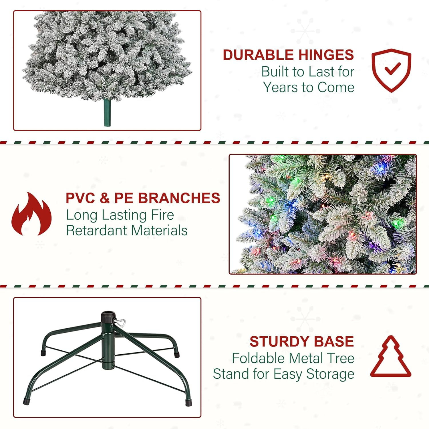 - Warranty: Our flocked Christmas tree is guaranteed for 1 years. Committed to your satisfaction, we provide direct manufacturer support and complimentary replacements for any quality-related issues within the warranty period.